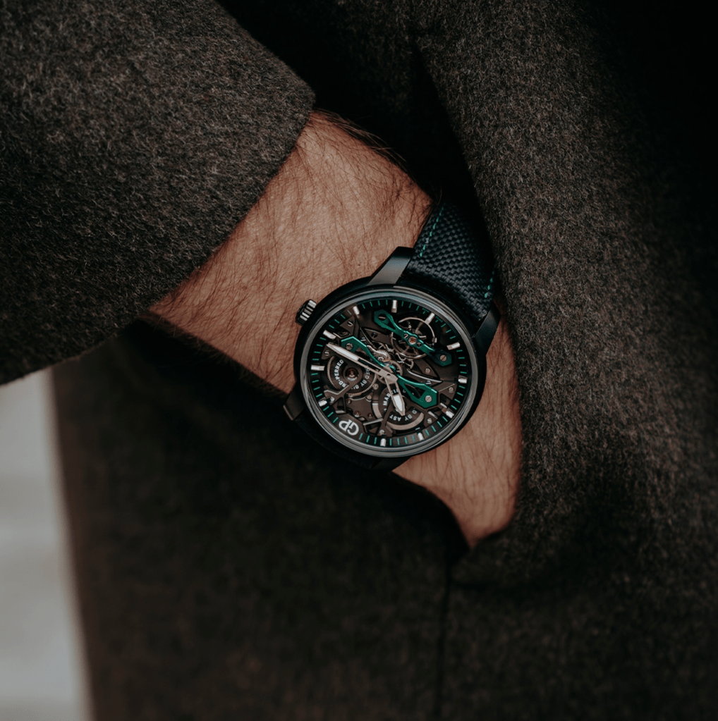 Girard-Perregaux has chosen this centerpiece to represent the fusion of both marques’ iconic heritage. In doing so, they unleash a spark of electricity in British Racing Green, matching the dynamically charged experience of the DB12. Their slender form, highly polished angles, and shapely contours add spectacular dimension amidst the blackened componentry, elevating the visual appeal of this timepiece to another level.